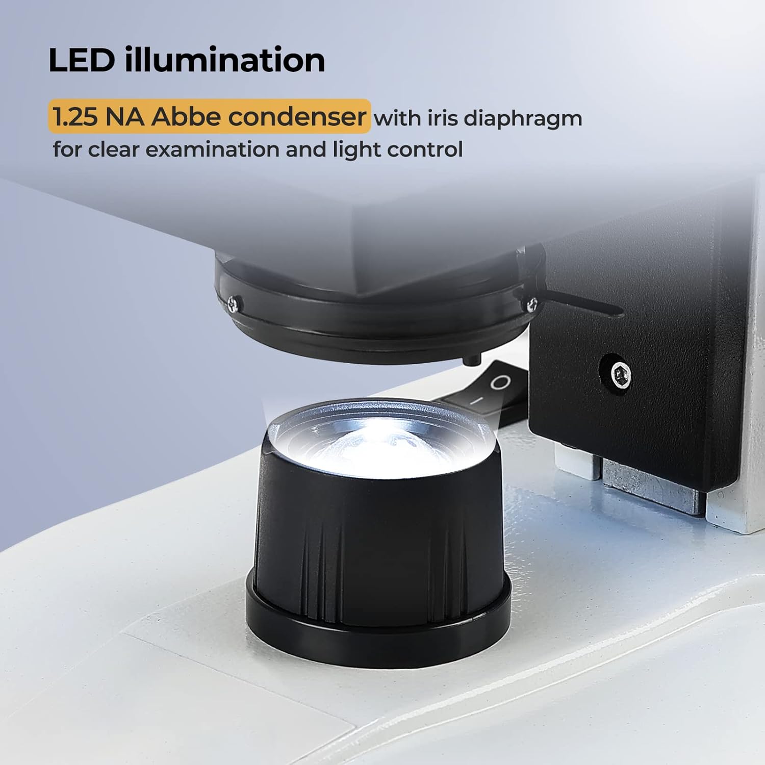 - [Eyepieces & LCD Screen]: Equipped with wide-field 10X/25X glass eyepieces fixed at an ergonomic 30 degree tilt to reduce neck strain, easily adjustable for different interpupillary distances without losing focus, 5MP Electronic eyepiece and 360 degree 7" large LCD display allows you to get a larger field of view directly from the screen without an external large screen display, provide a more comprehensive view and enable sharing. 4 Achromatic objectives offer 4x 10x 40x(s) 100x(Spring Oil).