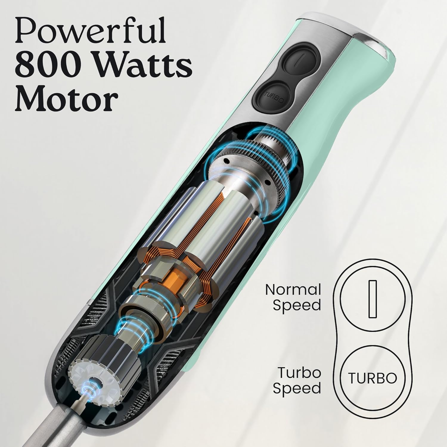 - POWERFUL AND DURABLE: This immersion blender, designed with a full-bodied, 800-watt copper motor, can quickly and effortlessly blend ingredients. The 304 stainless steel blade is rust and corrosion-resistant, making it ideal for long-term use. The heavy-duty yet compact design of this immersion blender handheld makes this hand blender ideal for mixing bowls, pots, pans, and beakers.